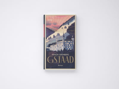 Das Aquarell des Schlosshotels in den Schweizer Bergen und die Typo auf der Schlaufe muten wie Reiseplakate aus einer mondänen, vergangenen Welt an. Letzte Sonnenstrahlen scheinen auf das im Abenddämmer liegende Luxushotel, das finaler Schauplatz des Schelmenromans ist. Im Kontrast zum Aquarell sind die Sonnenstrahlen als Vektorgraphik und mit einer Gold-Sonderfarbe gedruckt.
