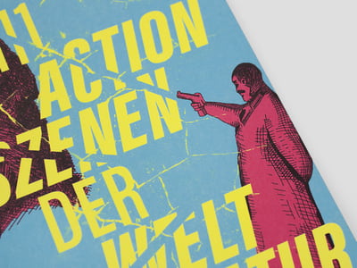 Manja Hellpap, Gestalterin: Die Zutaten standen bereit: 111 große Namen der Literaturgeschichte, 11 kraftvolle Illustrationen für ausgewählte Kapiteleingänge, ein strahlendes Neongelb als Auszeichnungsfarbe. Um der »Action« im Titel gerecht zu werden, wurde sie mithilfe verschiedener Schnitte der plakativen »Acumin Pro ExtraCondensed« ins Typographische übersetzt und die entstandene Rhythmik auf die Kapiteleingänge übertragen. Die einleitenden Texte in der »SoleilExtraBold« schlugen die Brücke zu den einzelnen Szenen, gesetzt in der »MillerText«, die als Editorial- und Zeitungsschrift auf die Herkunft der Geschichten, die Serie in der »Literarischen Welt«, verweist.