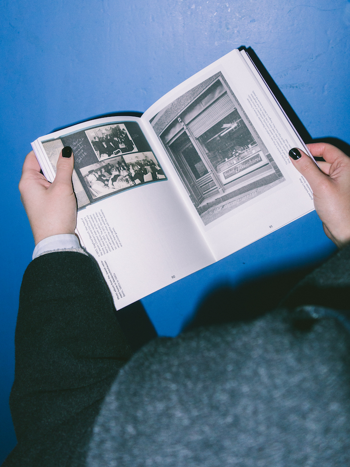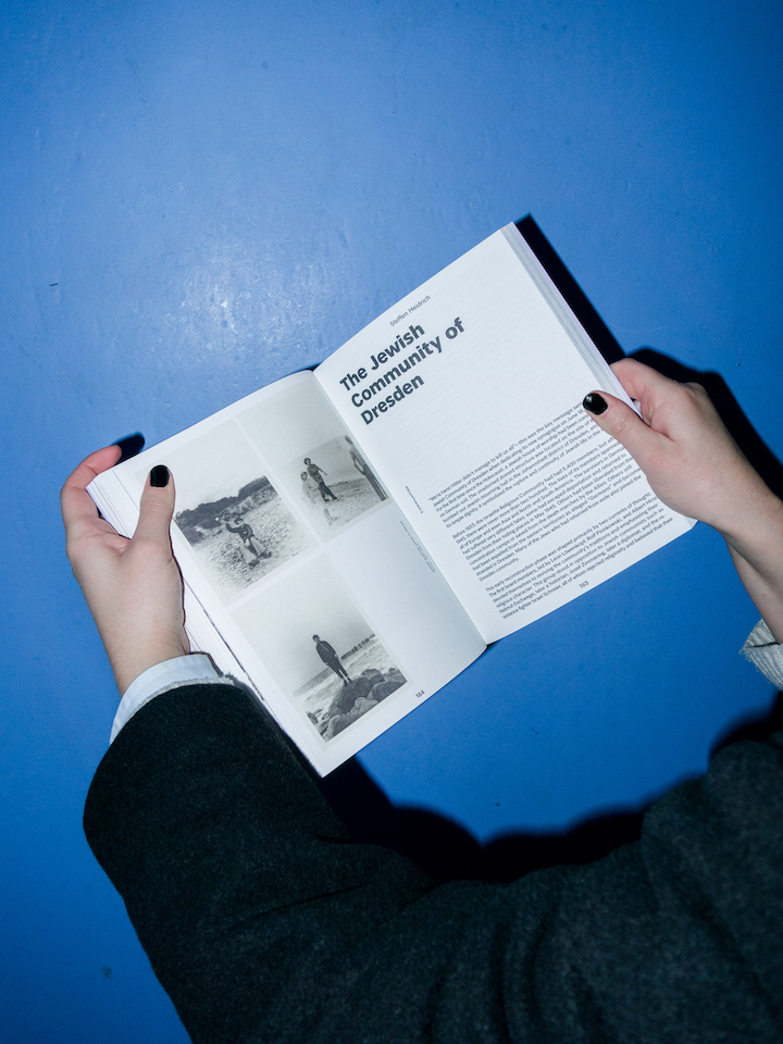 Die Kapitel im Ausstellungskatalog zu jüdischem Leben in der DDR beginnen mit der Präsentation eines Bildteils. Den privaten Fotografien, historischen Dokumenten und Objekten folgen die Aufsätze. Eine kräftige serifenlose Schrift nutzt nahezu das gesamte Format aus. Extrem schmale Ränder – die Seitenzahlen sind nicht einmal fünf Millimeter vom Schnitt entfernt – bewirken eine hohe typografische Dichte. Fünf verschiedene Satzbreiten stehen zur Verfügung, um die Textsorten abwechslungsreich und sinngebend zu strukturieren. Immer sind sie nach vorne, zum Vorderschnitt hin orientiert, zum Bund hin ergeben sich Freiräume. So macht beispielsweise auf einer Seite eine verschmälerte Kolumne Platz für eine Marginalspalte, während die gegenüberliegende ihre Zeilenlänge behält. Oder beide Seiten verbreitern zum Bund hin den schmalen Raum gerade so, um die Kapitelüberschrift als Kolumnentitel aufzunehmen, und zwar als Variante in die Senkrechte gedreht. Im Bildteil steuert eine solche Drehung der Bildlegenden die Aufmerksamkeit, die den Fotografien zugutekommt.